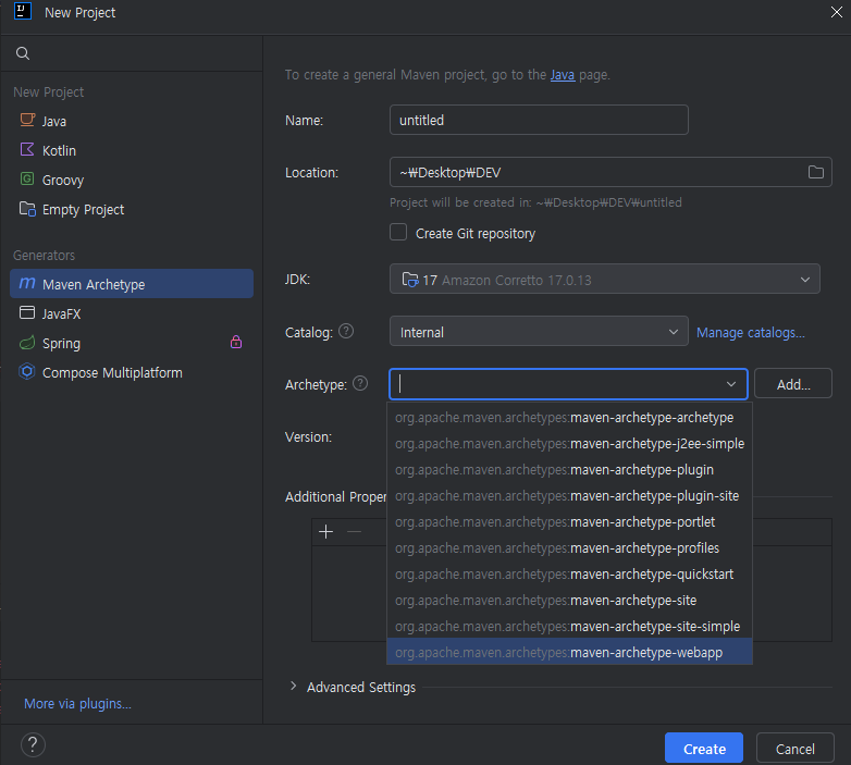 - Advanced Settings 클릭 후 GroupId, ArtifactId 작성